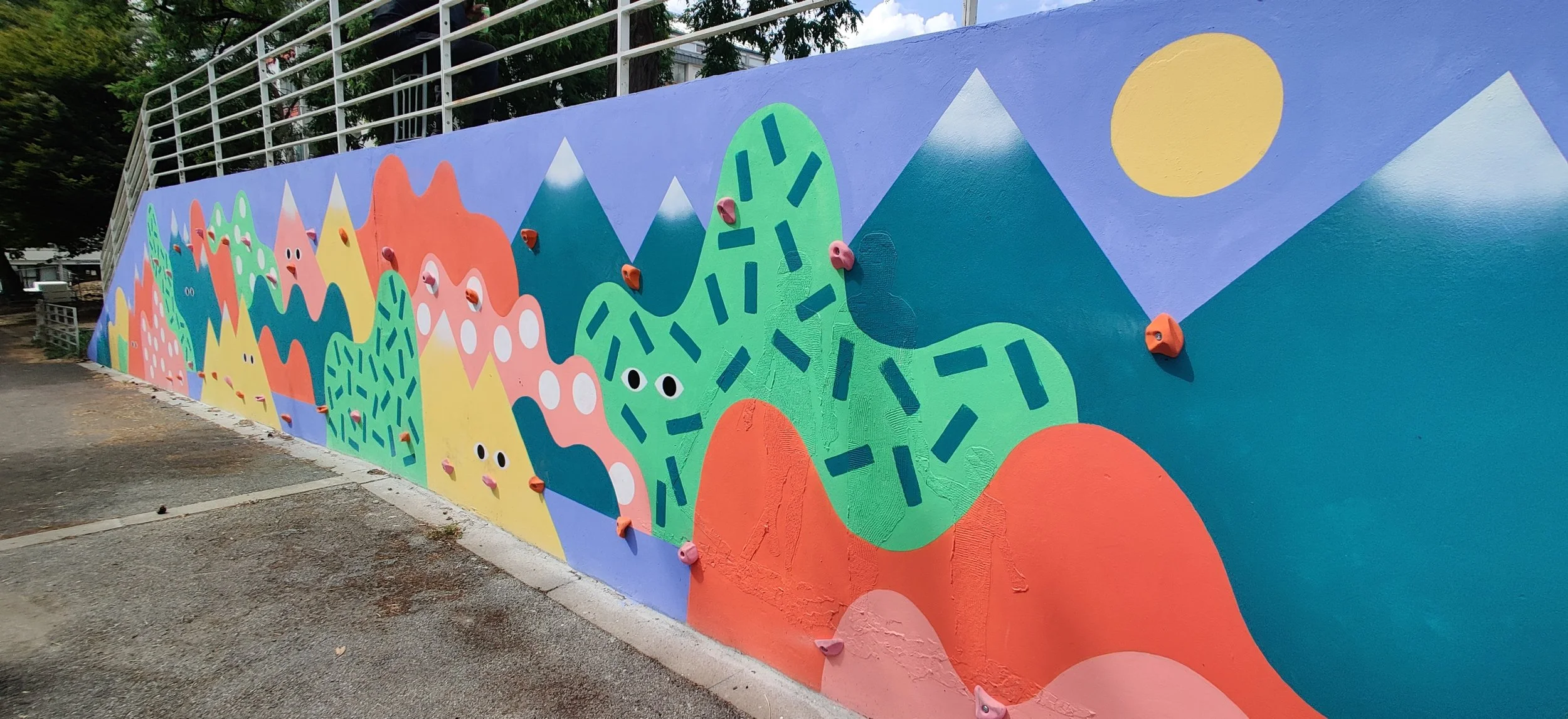La fresque se distingue par ses formes fluides, ses aplats colorés et sa lisibilité forte, tout en intégrant les contraintes d’un mur à usage sportif. Elle incarne parfaitement l’univers de Barthélémy Lanzini, fait de géométrie, de rythme visuel et de lien aux éléments urbains. C’est aussi une invitation à bouger, à jouer, à grimper… et à s’émerveiller.