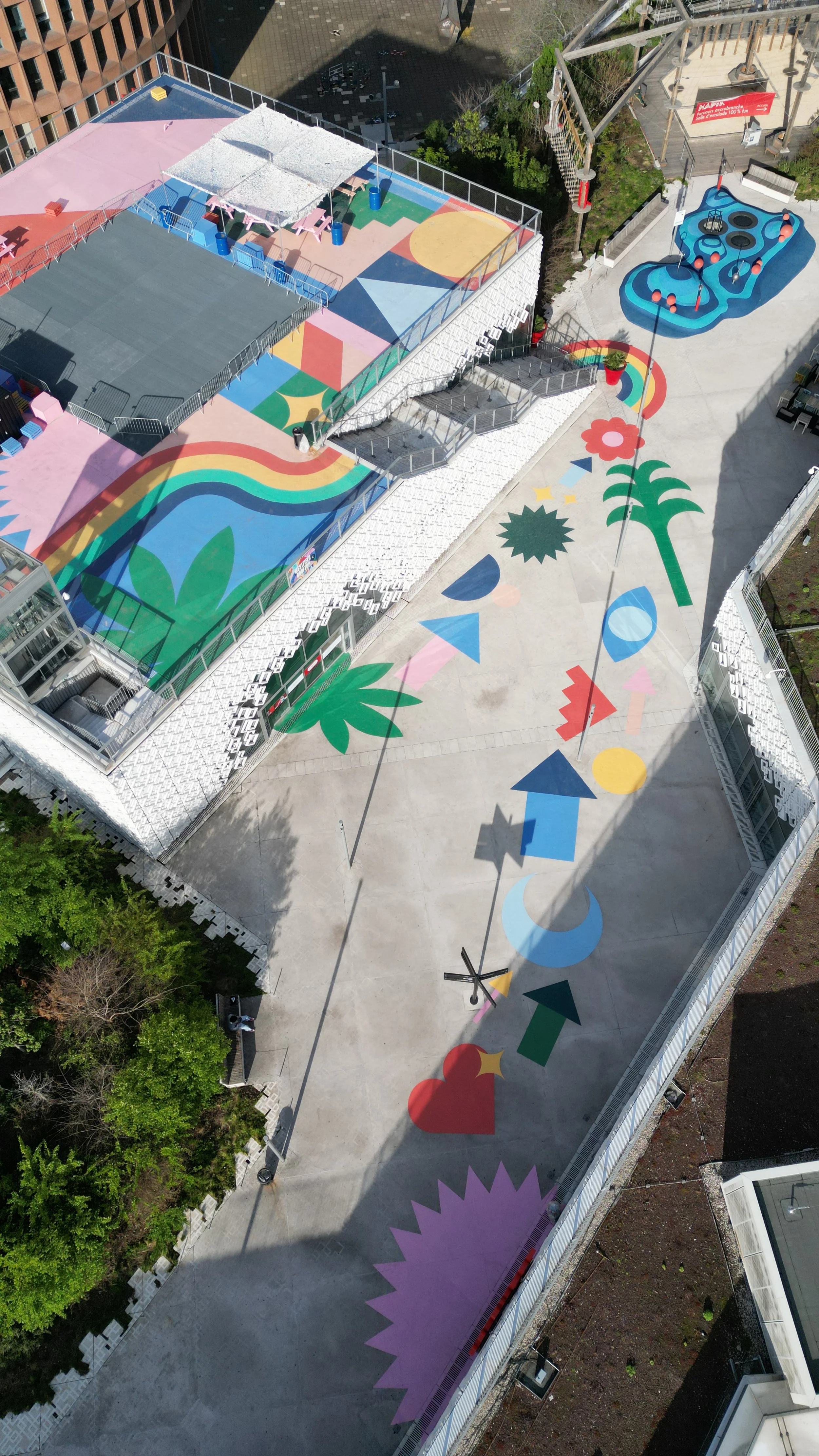 Peinte directement sur le sol, cette intervention artistique grand format s’inscrit dans la continuité du travail de Tomalater : formes fluides, motifs géométriques, palette éclatante. Mais au-delà de l’impact visuel, ce chemin graphique joue un rôle très concret : orienter le flux de visiteurs vers le rooftop, créer un repère clair, lisible et joyeux.
